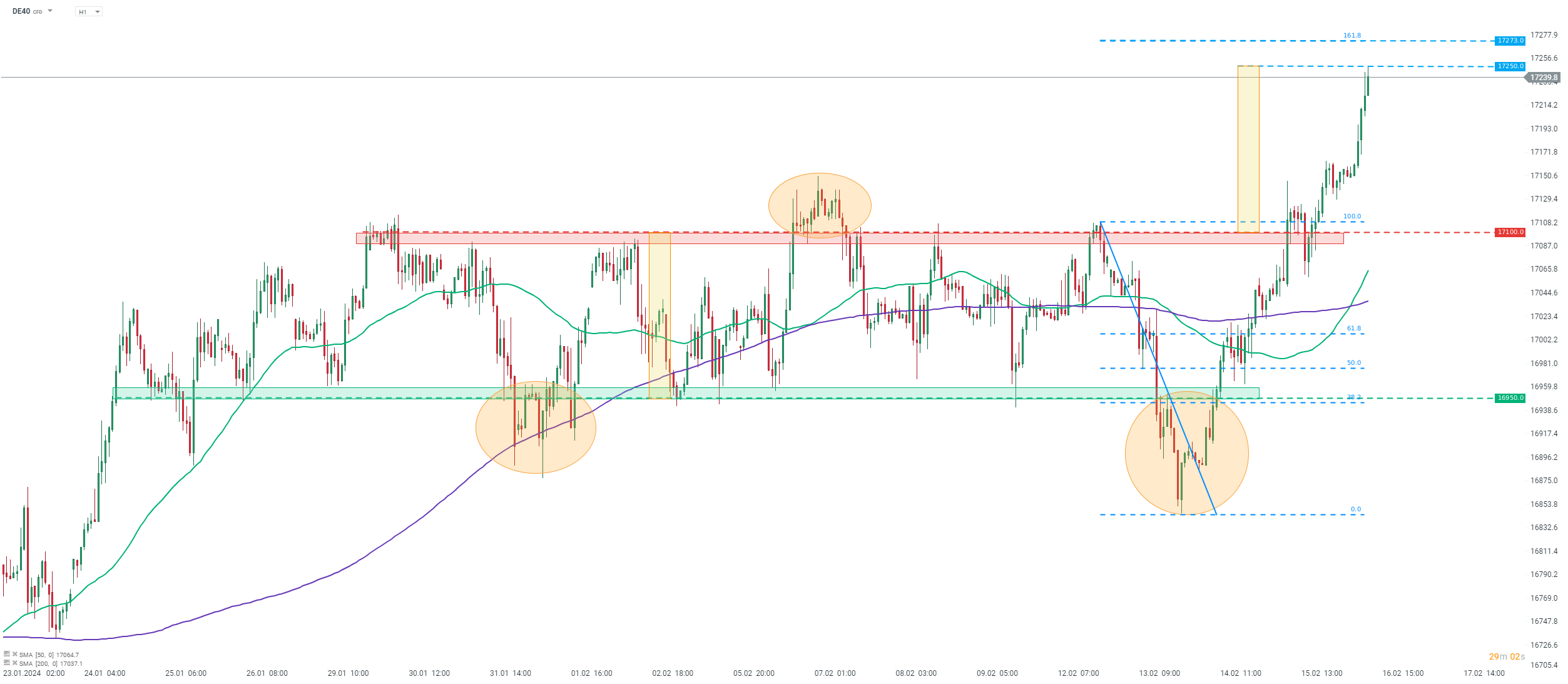 Price moves on the DAX futures (DE40) have been largely confined to the 16,950-17,100 pts trading range since the beginning of the February. Index made a few false breakouts from the range over the past 2 weeks (orange circles on the chart above), but all of them turned out to be short-lived. However, a break above the upper limit of the range was made yesterday and bullish momentum continues to be strong. Index is closing in on the textbook target of the upside breakout from the range in the 17,250 pts area. Breaking above this hurdle would pave the way for a text of the 161.8% exterior retracement of the February 12-13, 2024 correction, which can be found in the 17,273 pts area.