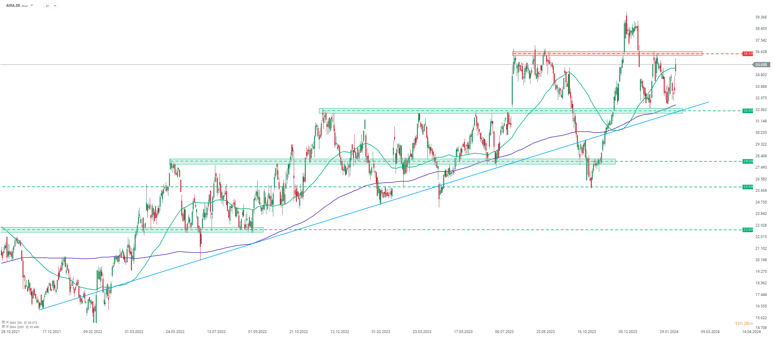 Aixtron (AIXA.DE) is one of the best performing German stocks today. Company rallies over 6% after solid earnings from Applied Materials boosted sentiment towards producers of semiconductor manufacturing equipment. Stock is trading at the highest level since the end of January and is approaching resistance zone in the €36.50 area. Source: xStation5