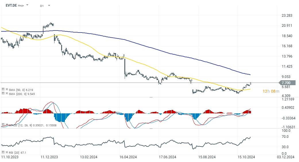 Evotek (EVT.DE) is among the top gainers on the German market today. Stock is trading more than 8% higher at €7.70. The company will publish its quarterly results on Wednesday 6 November.