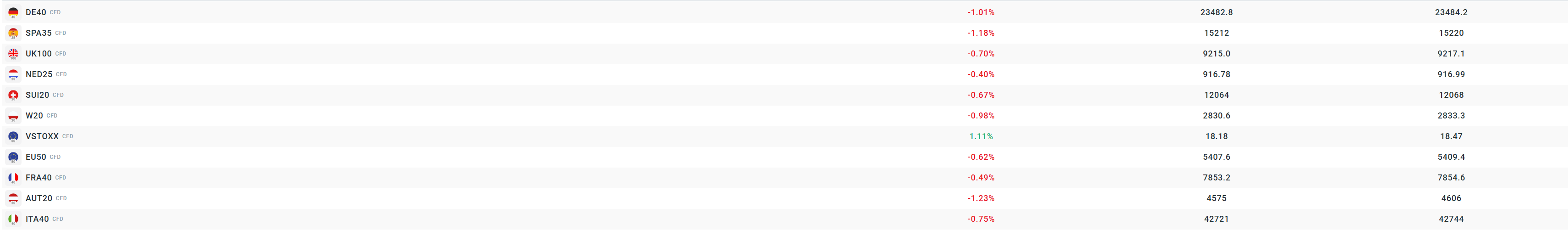 European indices are slightly down today. The German DE40 is losing around 1%, the Spanish SPA35 has dropped nearly 1.2%, and the British UK100 is also down by close to 0.8%. Markets in Switzerland, the Netherlands, and Italy are also underperforming slightly, with indices falling by a few tenths of a percent.
