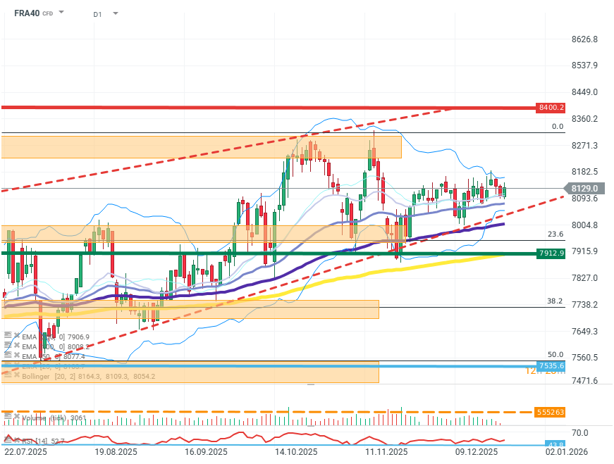 Volatility and trading on European exchanges are noticeably reduced due to the closure of many of them during the Christmas holidays. Trading will not take place on exchanges in Germany, Italy, Switzerland, Poland, the Czech Republic, Scandinavia, and the Baltic countries. Trading hours are shortened to 12:30 in the UK, 14:00 in Spain, and 14:05 in France. Among contracts, FRA40 is recording gains, rising by 0.3% today.