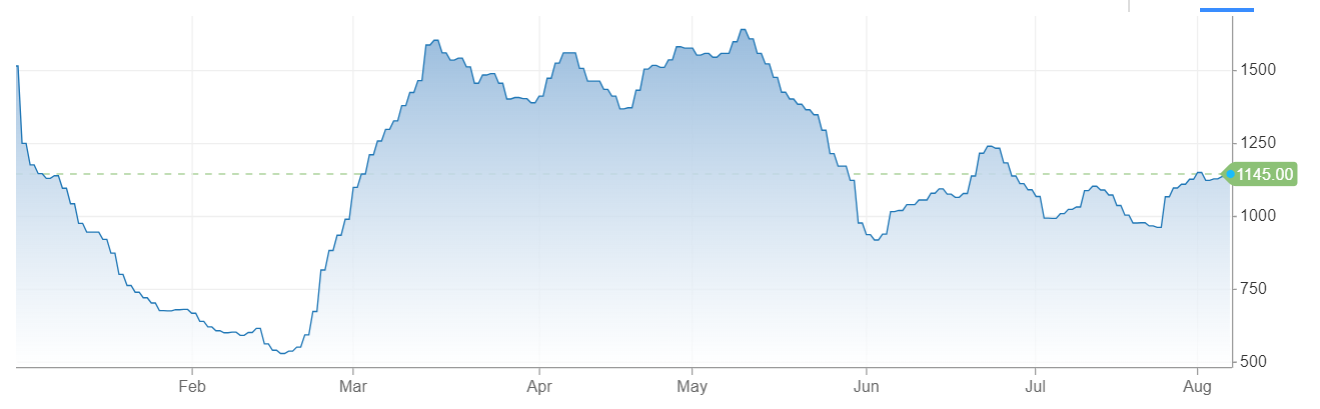 However, the Baltic Dry index tracking average dry freight prices on the world's 20 largest trade routes is still trading around 1,100 points - well below the March-May levels but still more than 100% above the March 2023 500 points.