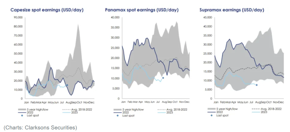 Seasonally, freight rates for all three types of container ships (3 different sizes) are well below average). Source: Clarkson Securities