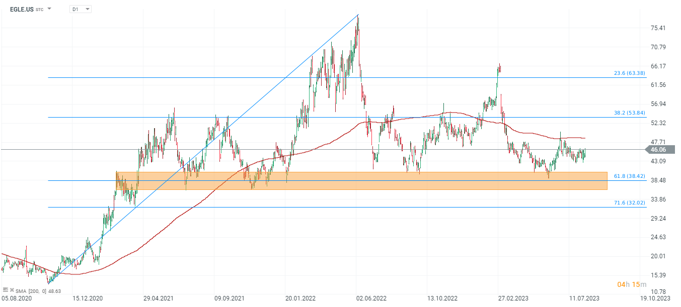 Eagle Bulk's shares are holding support set by previous price reactions near $40 - this coincides with the 61.8 Fibonacci retracement of the upward wave from the spring of 2020. The price is below the SMA200 (red line) - a rise above it may herald a possible longer rebound. Source: xStation5