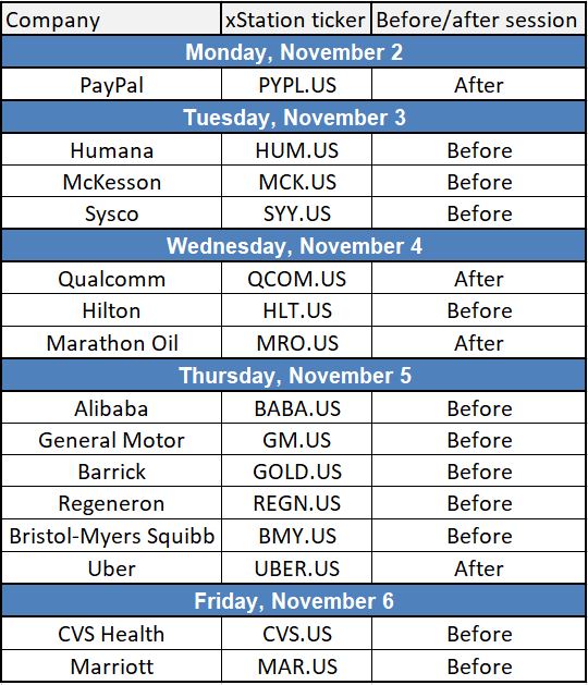However, one should keep in mind that earnings will be of second importance this week. Firstly, there are no reports from big name companies set to release. Secondly, there is not a single day that will see an avalanche of key reports (like Super Thursday last week). Last but not least, its election week! US presidential elections are unquestionably a key event of the week and no earnings report will be even close as important. While elections are held tomorrow, the event is likely to impact markets for days if not weeks. Apart from that, traders should also remember about 2 key macro events scheduled for this week - FED rate decision (Thursday, 7:00 pm GMT) and NFP release for October (Friday, 1:30 pm GMT).