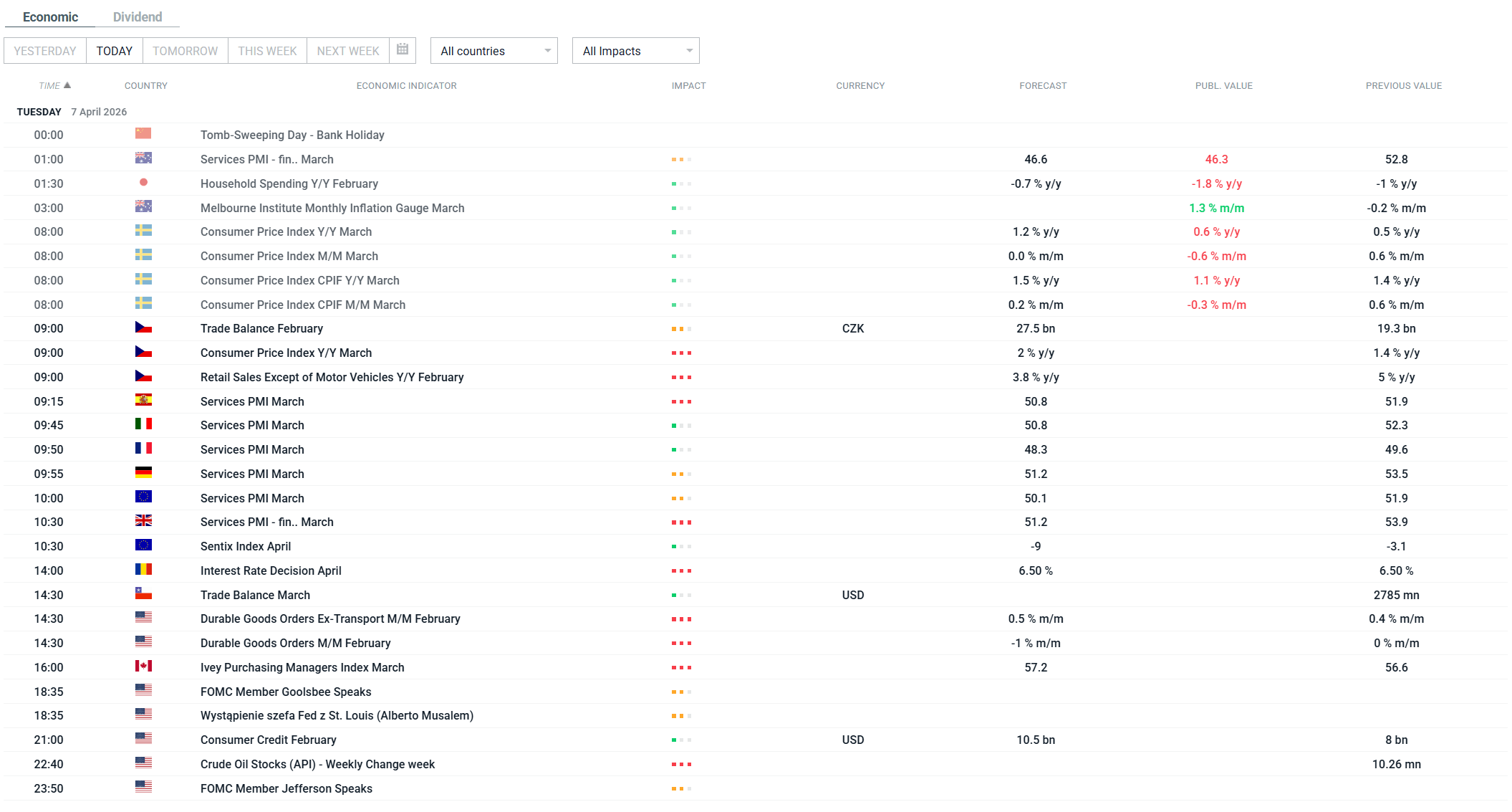 We are kicking off the first full trading session on the financial markets following the holiday break. Trump reiterated that tonight (Wednesday at 3:00 a.m. European/Polish time) is the “deadline” for Iran to open the Strait of Hormuz—otherwise, he threatens to destroy the country’s energy infrastructure. At the same time, he added that talks are “going well” and that he would like to reach an agreement. Iran has officially rejected the ultimatum, calling Trump’s threats “arrogant rhetoric,” but Axios reports that the U.S. views this response as a negotiating tactic, not a definitive closing of the door. Behind-the-scenes dialogue between the parties reportedly remains active, and Washington is keeping open the possibility of delaying military action if a credible path to a deal emerges.