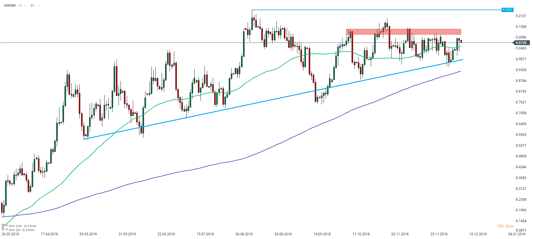 USDSEK has been trading in the consolidation range for the major part of the year. The pair continues downward move started on Tuesday today and in case the situation is to remain unchanged in the latter part of the day we cannot rule out possibility of USDSEK testing the 9.00 handle. Source: xStation5