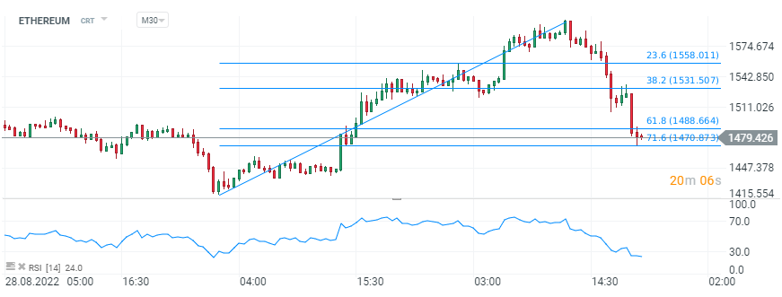 Ethereum chart, M30 interval. RSI is again entering the oversold area. Declines have been temporarily halted at the 71.6 Fibonacci retracement. Further southward movement may cause another wave of liquidation. Source: xStation5