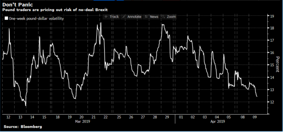 Očakávaná týždenná volatilita na menovom páre GBPUSD je najnižšia od 20. marca, čo naznačuje, že obchodníci očakávajú nižšie riziko na libre. Pokles očakávanej volatility môže naznačovať, že obchodníci počítajú s nižšou pravdepodobnosťou scenára Brexitu bez dohody, čo by mohlo v nasledujúcich dňoch pomôcť libre k rastu. Ďalší smer menového páru však bude závisieť od vývoja Brexitu. Zdroj: Bloomberg