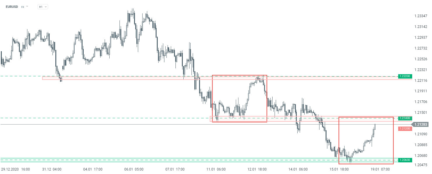 EURUSD is trading near the intraday resistance marked with local 1:1 structure (red rectangles) and previous price reactions (1.2140). Should sellers manage to halt advance here, downward correction may be launched and it could reach recent lows at 1.2060. However, should we see a break above the 1:1 structure, the next resistance to watch can be found at 1.2220, where the supply area is located. A break above could change sentiment to bullish.
