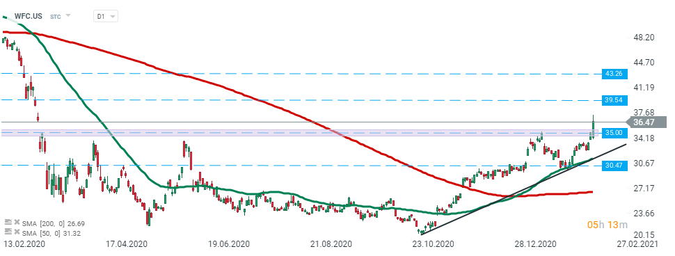 Wells Fargo (WFC.US) - positive news triggered a big price jump and stock broke above the local resistance at $35.00. Should upbeat moods prevail, next resistance at $39.54 may come into play. Source: xStation5