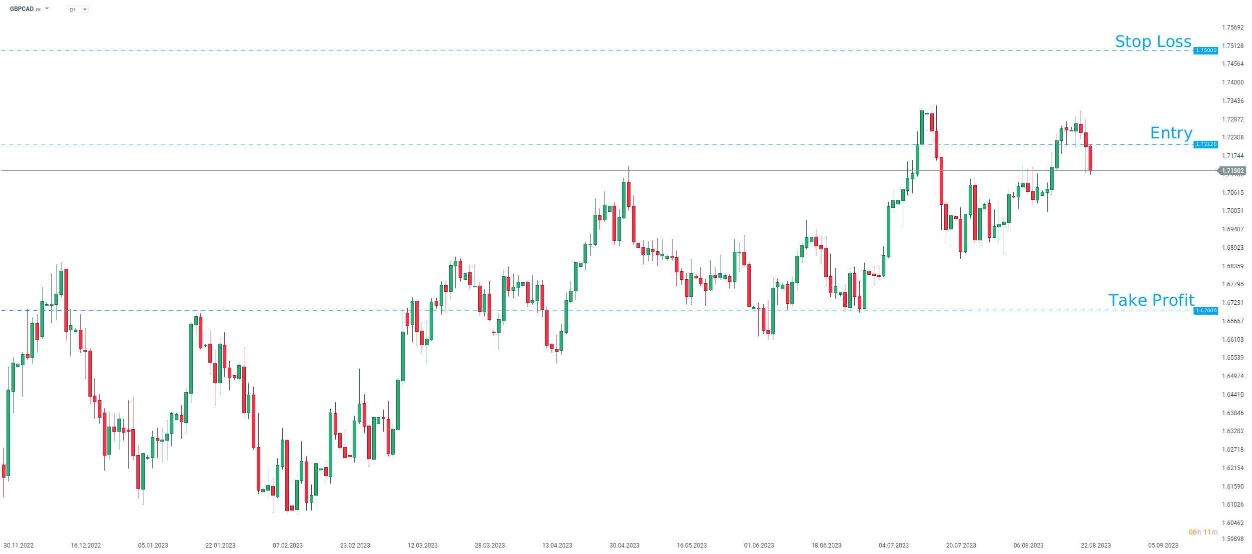 TD Bank recommends taking a short position on GBPCAD at market price with a target of 1.6700 and a stop loss order placed at 1.7500. Source: xStation5