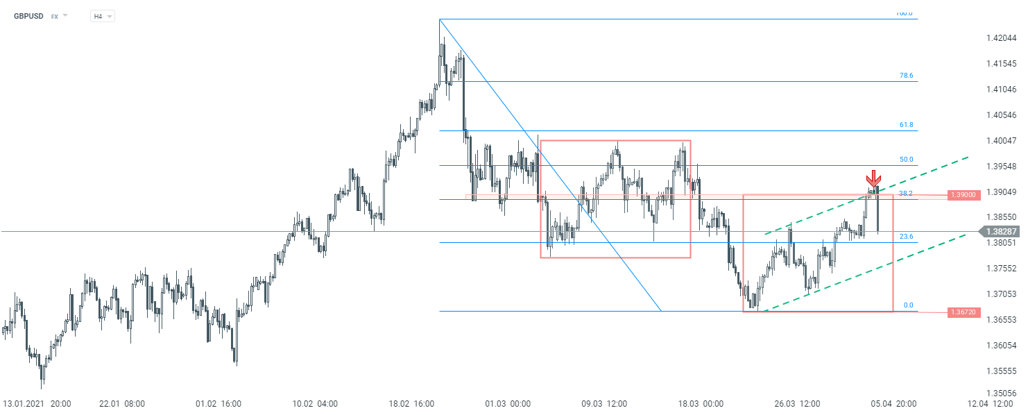 British pound has made some noticeable gains yesterday after Boris Johnson outlined next steps of the way out of lockdown. However, the move is being erased today with GBP being one of the worst performing G10 currencies. GBPUSD trades around 0.5% lower on the day and pulls back below 1.3900 handle. The pair retreats from the area marked with the upper limit of market geometry as well as the upper limit of the local upward channel. In case downbeat moods prevail, correction may deepen with the lower limit of the upward channel being the first major support to watch.