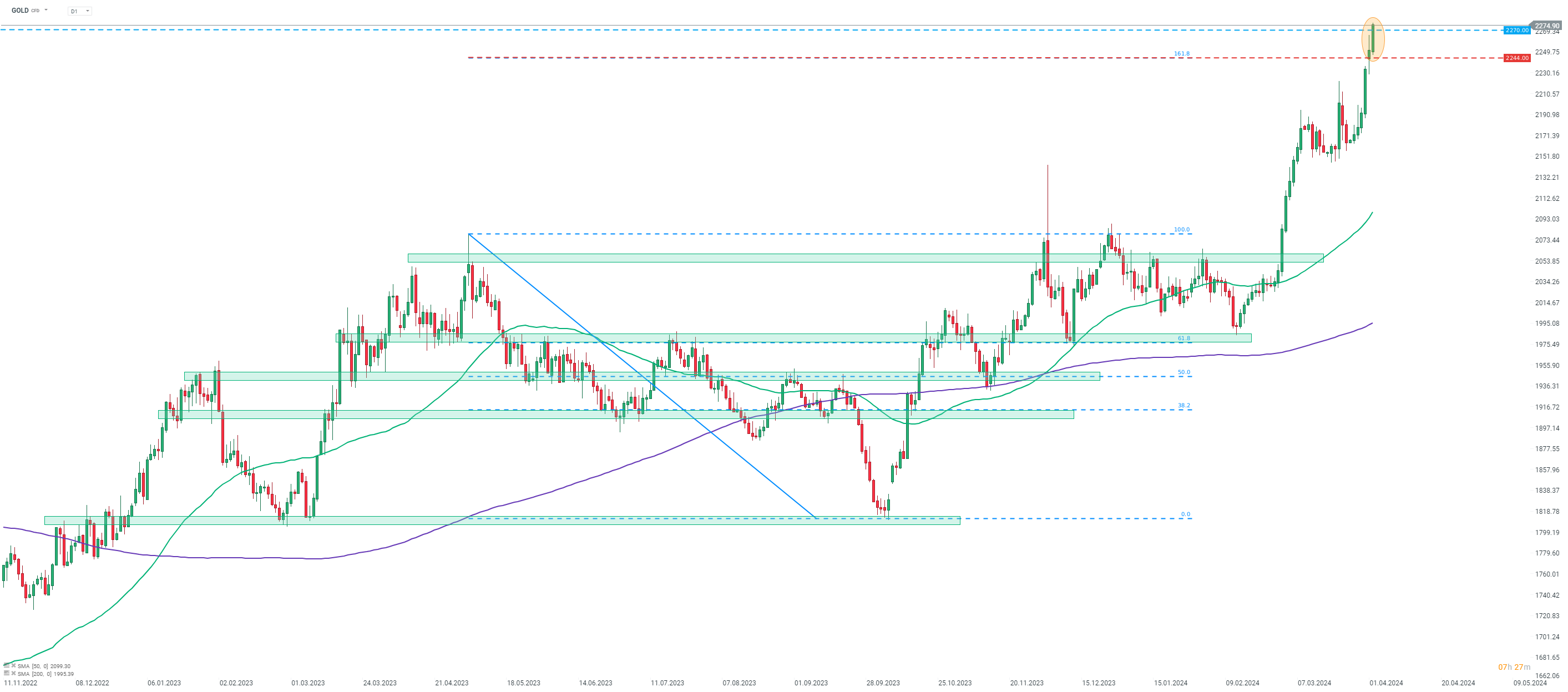 Rally on the gold market sees no signs of easing. The precious metal is up over 1% today, and climbs above $2,270 per ounce mark for the first time in history. USD weakness and safe haven flows seem to be playing a key role in today's move higher.