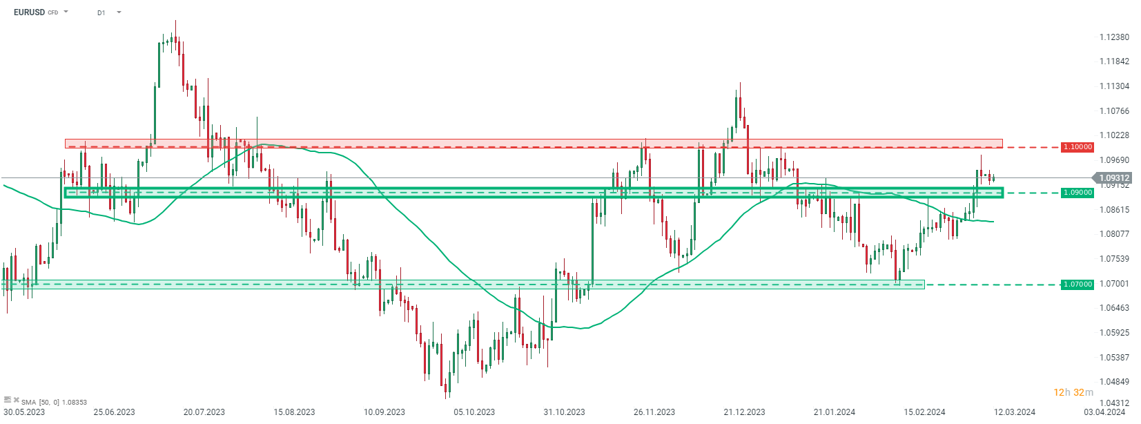 EURUSD has been giving back part of recent gains in the past few days. The main currency pair pulled back below 1.0950 mark and is looking towards a retest of the 1.09 price zone, but this time as a support. A hotter-than-expected CPI reading may provide more fuel for the pullback. Source: xStation5