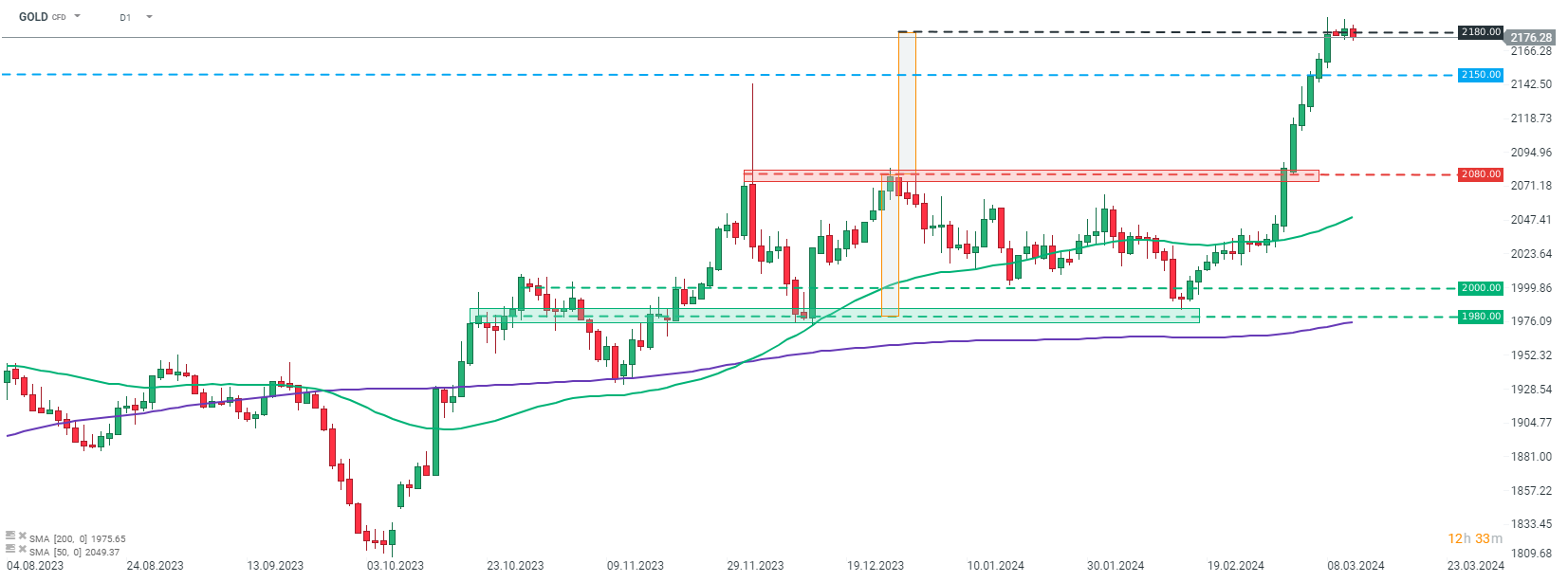 GOLD rallied above $2,150 per ounce recently, setting fresh record highs. Price of the precious metal reached $2,180 per ounce area, marked with the textbook target of the upside breakout from trading range, after which the advance was halted. Signs of investors' indecisiveness can be spotted on the chart in recent days and today's CPI print may help make the outlook more clear. Source: xStation5