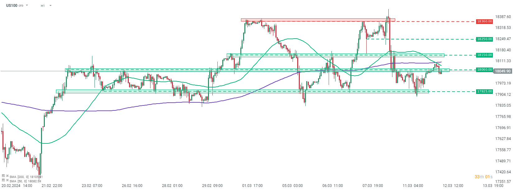 Nasdaq-100 futures (US100) halted recent downward move at the 17,925 pts support zone. However, bulls failed to push the index back above 50- and 200-hour moving averages during the subsequent recovery move. A lower-than-expected CPI reading could help bulls regain control over the market and potentially break above the aforementioned moving averages. Source: xStation5