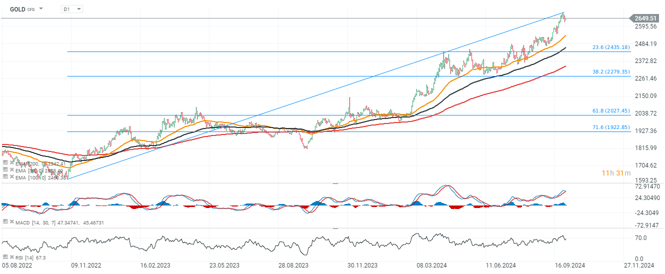 On the other hand, Federal Reserve looks really dovish, with Fed Bostic doesn't rule out even 50 bps cut on the November meeting (if labor market weakens) and Goolsbee signalled clearly that 'there will be a lot of rate cuts'. Overall, easing policies on both side of the Atlantic (US - Eurozone) and Chinese interest rate cuts and stimulus programs, with geopolitical tensions and still hard to predict outcomes of the easing cycles, lifts demand on gold, as 'recession hedge'.