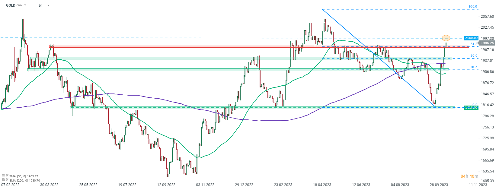 Taking a look at GOLD chart at D1 interval, we can see that the price of this precious metal has almost reached a psychological $2,000 per ounce level earlier today and trades at the highest level since mid-May 2023. Gold price has already jumped around 10% since the beginning of Israel-Hamas war and bulls do not seem to be bothered by today's pick-up in yields. However, around half of today's gains has been erased already and should gold swing to negative by the end of the day, a bearish pin bar pattern would be painted in a important resistance area, marked with 61.8% retracement of the May-October downward move.
