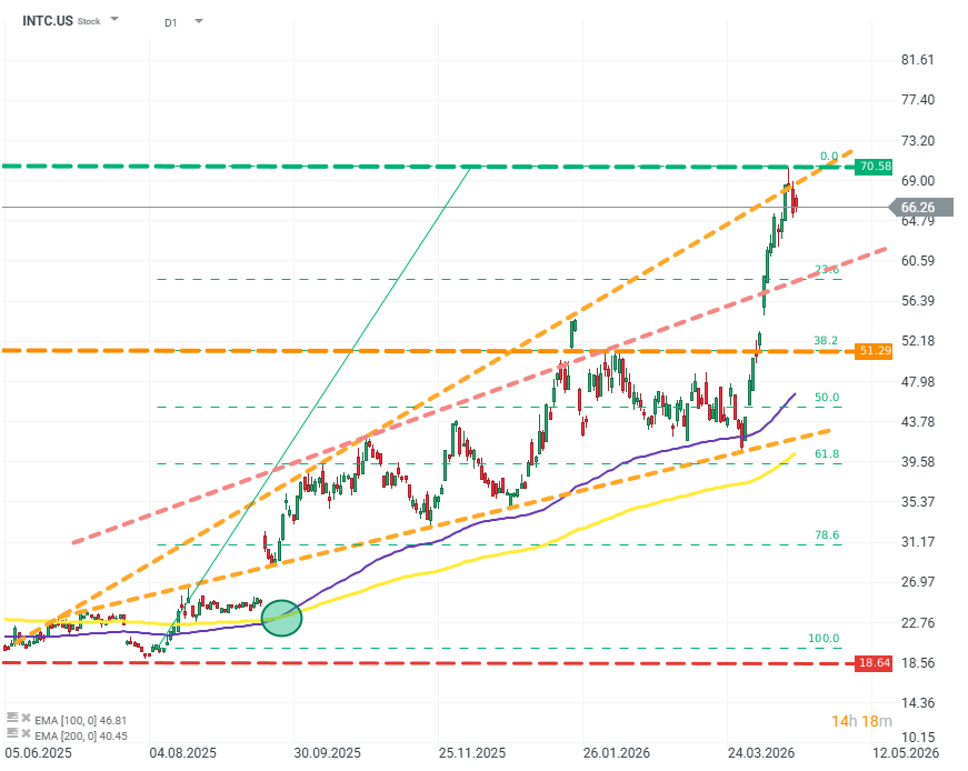 The latest rally can only be described as hyperbolic: more than 70% in less than a month, despite no fundamental changes to the business model or the broader business environment. The move only stalled around the psychological ~$70 level. Intel has reached valuations at this level only twice in its history - during the dot-com bubble and during the Covid pandemic. Could the stock once again be signaling a late-stage phase of a speculative bubble? Source: xStation5