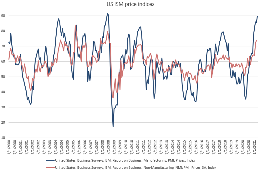 The headline number slowed from 64.7 in March to 60.7 in April on the back of slower growth of orders, production and employment. To be sure, this is still very high reading, representing booming manufacturing but supply constraints are more and more clear. We can see that in inventories subindex dropping below 50 (to 46.5) and customer’s inventories dropping to a very low level of 28.4! This obviously goes along with price pressures and the prices subindex soared to 89.6 pts.