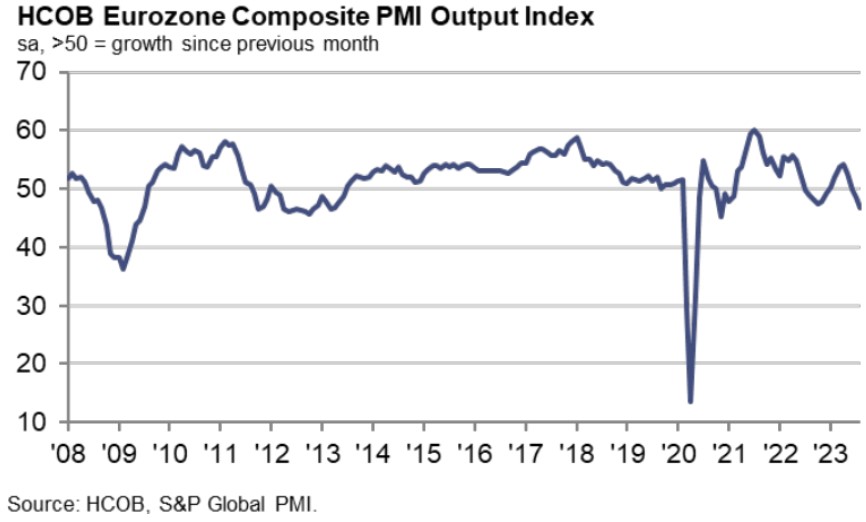 We have the lowest reading since 2020. HCOB writes in a commentary that the eurozone did not fall into recession in the first half of the year, but the second half of the year comes into big question. The services sector, which had been a stabilizing force for the economy for many months, now appears to be a strong drag, and the industrial sector is likely to decline further. HCOB forecasts -0.1% change in GDP for Q3 in EMU.