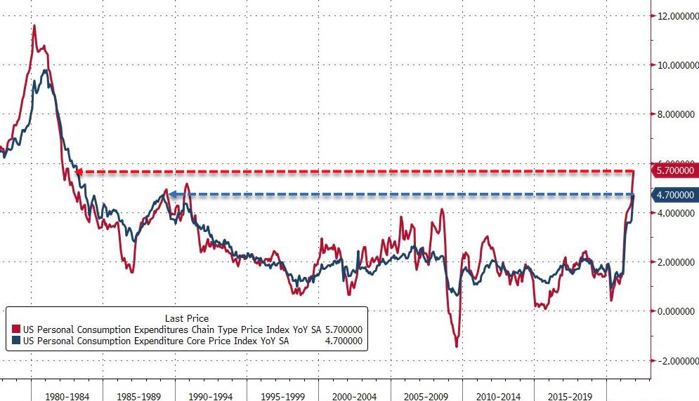 The headline PCE deflator jumped 5.7% YoY, which is the highest rise in 39 Years. Core PCE price index accelerated 4.7%. That was the largest increase since February 1989 and followed a 4.2% year-on-year advance in October. Source: Bloomberg via ZeroHedge