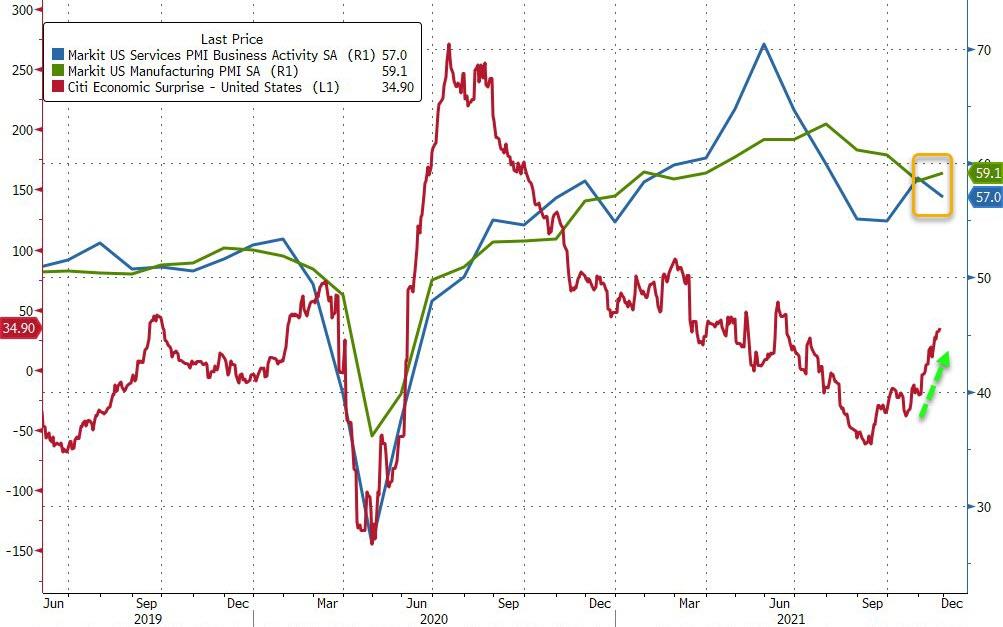 However despite this upbeat narrative, today's report showed that inflation is gaining steam. The survey’s measure of prices paid by businesses for inputs surged to 78.1, which is the highest level since the series started in 2009, from 74.1 in October. Meanwhile input cost inflation hit a six-month high. These higher prices are being passed on to consumers, indicating that inflation could remain elevated for a longer period of time, contrary to Fed Powell assurances, that this is only a transitory phenomenon.