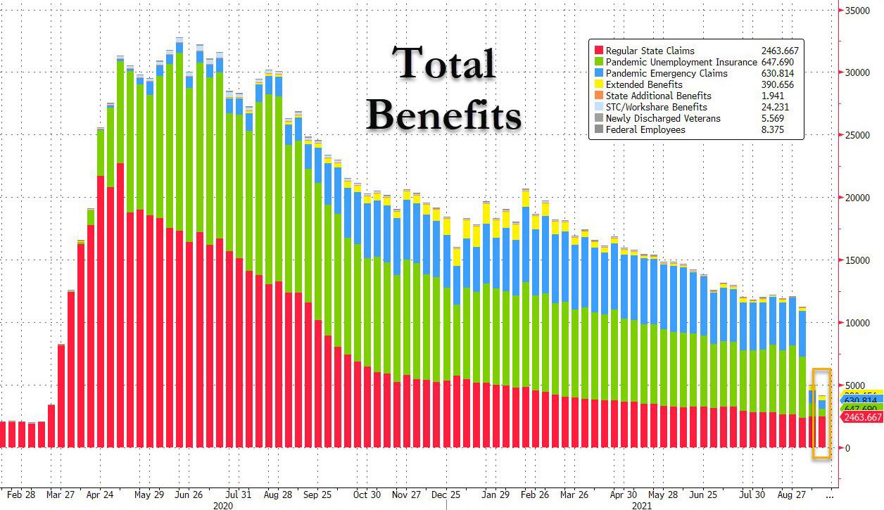 Also the number of US citizens who are receiving benefits under all programs dropped to just 4.74 million, in the week ending Sept 18, down from 5 million a week prior. Last year, this number stood at 24.6 million.