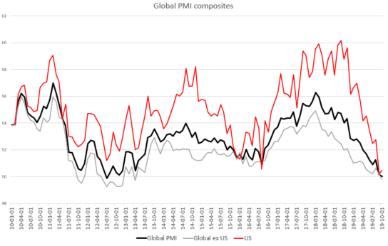 There is an increasing number of theories that coordinated global monetary stimulus will help avoid recession and that a cyclical low is already past us. This is clearly the theory favoured by the markets as the indices in Europe and US are storming to fresh highs, completely discarding the data. The “recovery” scenario is not impossible but so far the data has not confirmed it. In Europe and US the PMI/ISM indices have generally stabilized, albeit at levels close to decade lows. Meanwhile many key emerging markets have seen business sentiment plummet in October – that includes all key regions: Europe (Poland), Asia (India) and Americas (Mexico). While there are few PMIs still to be published in non-manufacturing sectors (most notably in the US), our global composite is headed for the lowest print since 2012.