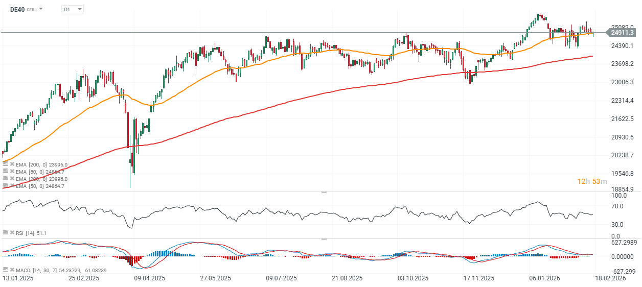 Sentiment in European markets is mostly optimistic, with the three major indices — the FTSE, DAX and CAC40 — posting modest gains; commodity-sector stocks are performing particularly well. At the same time, U.S. index futures point to a lower open on Wall Street, with the US500 and US100 down around -0.1% to -0.3%.