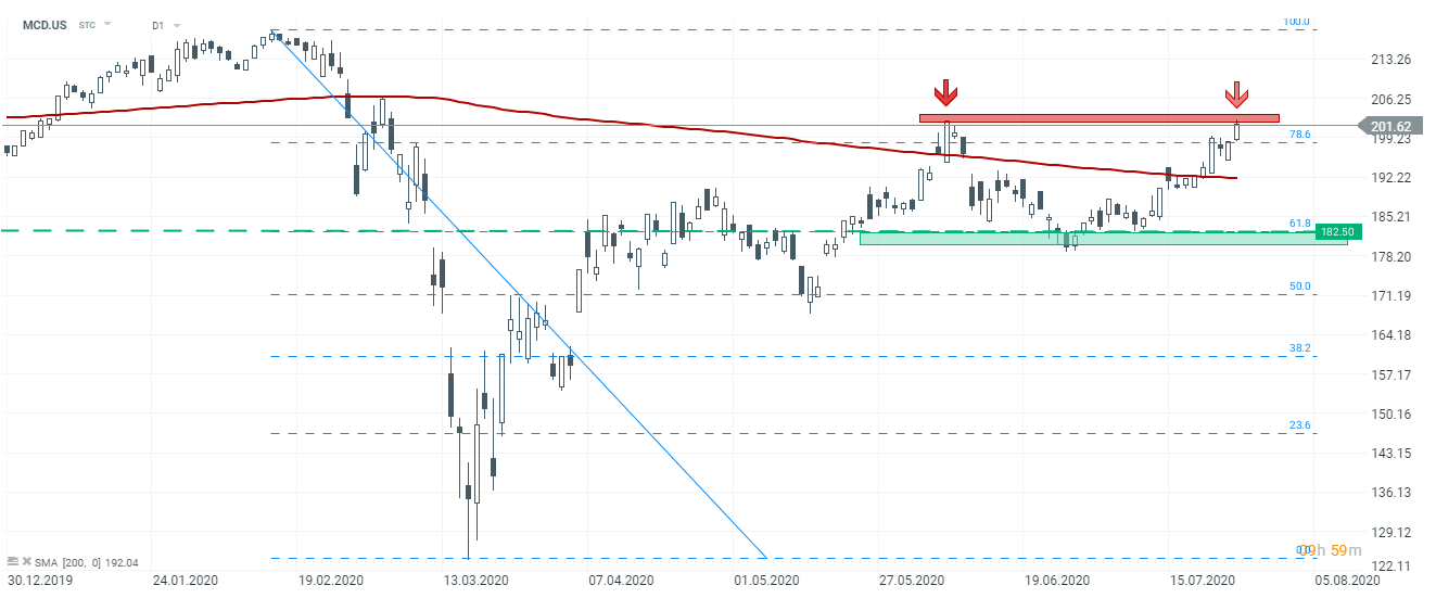 McDonald’s Corp (MCD.US) shares tumbled in today’s premarket trading as investors might be worried about bigger-than-expected drop in global same-store sales. Despite solid sales in the U.S. (where the firm operates more than a third of its restaurants), stock is set to open lower today. Should bears take control in the next few days, the $182.50 area (which is additionally strengthened by 61.8% retracement of the February-March drop) should serve as a crucial support. On the other hand, if bulls regain control, one should focus on recent local highs ($202.00 area). Source: xStation5