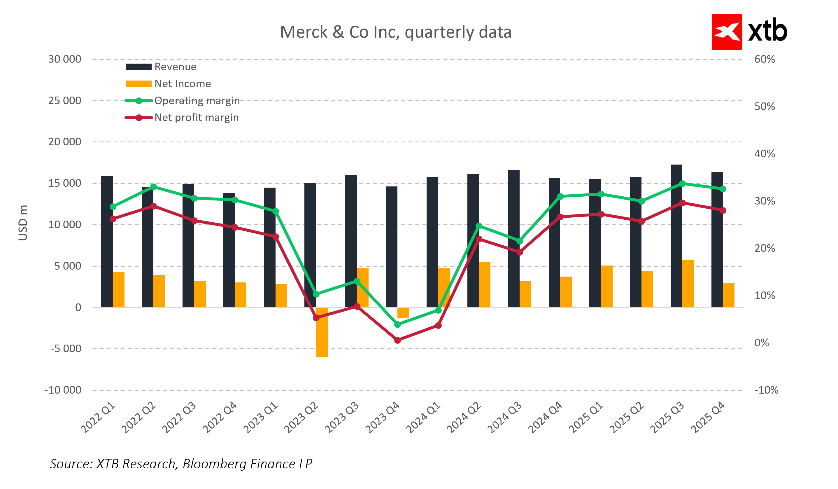 Despite strong quarterly results, Merck’s guidance for 2026 was somewhat disappointing: the company expects revenue between USD 65.5 billion and USD 67 billion, with adjusted EPS of USD 5.00–5.15, compared with analysts’ expectations of USD 67.5 billion and EPS of USD 5.27. Gross margin is projected at approximately 82%, slightly above market expectations of 81.8%.