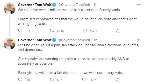 Tom Wolf, Governor of Pennsylvania, said via Twitter that there are still over one million votes left to be counted. He said that he is going to deliver on his promise of counting every vote. Those remarks likely related to Trump's speech, in which he claimed counting should end to avoid fraud, as Tom Wolf labelled it a partisan attack on elections. Pennsylvania is one of the key states as 20 electoral votes are at stake there. According to the latest data from NPR, Trump leads 56-43 in Pennsylvania with estimated 64% of the votes counted.