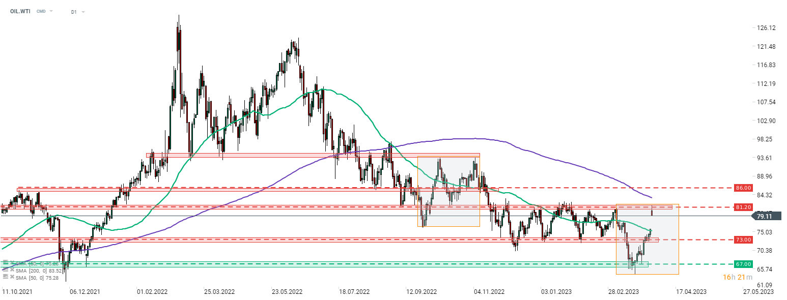 A surprise output cut from OPEC triggered a spike on the oil market. WTI (OIL.WTI) launched a new week near the $81.20 resistance zone, marked with the upper limit of previous trading range as well as the upper limit of the Overbalance structure. However, bulls failed to break above it on the first attempt. Source: xStation5