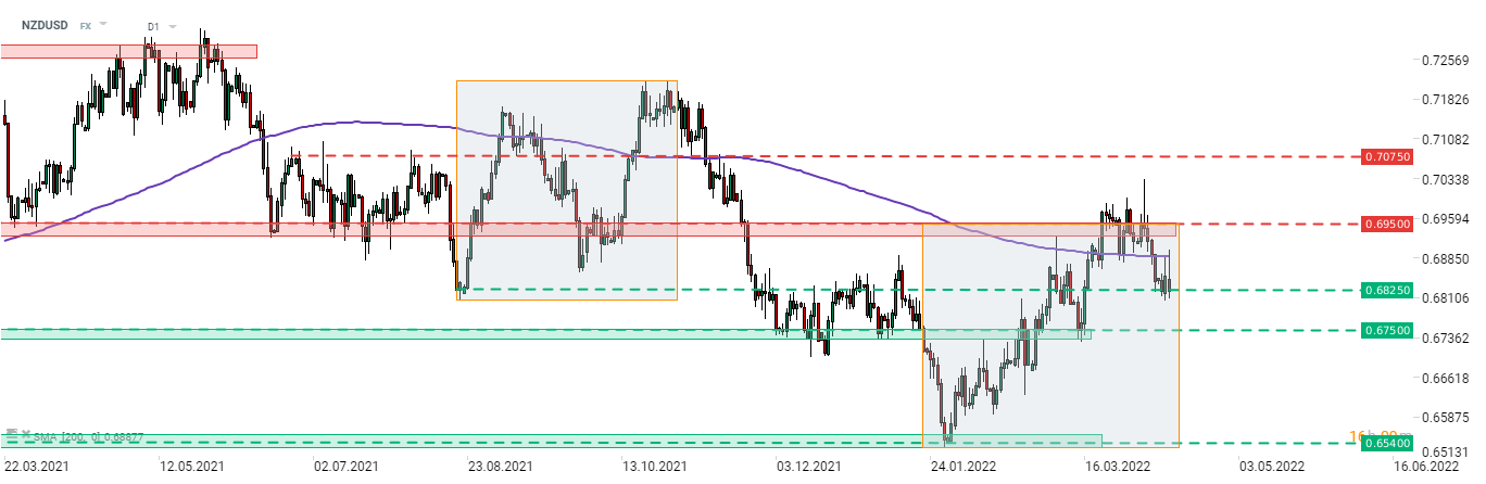 NZDUSD gained following a bigger-than-expected rate hike from RBNZ today. However, gains were already erased and now the pair is testing the 0.6825 support zone again. Note that today's advance was halted by the 200-session moving average (purple line), just as it was the case yesterday. Source: xStation5