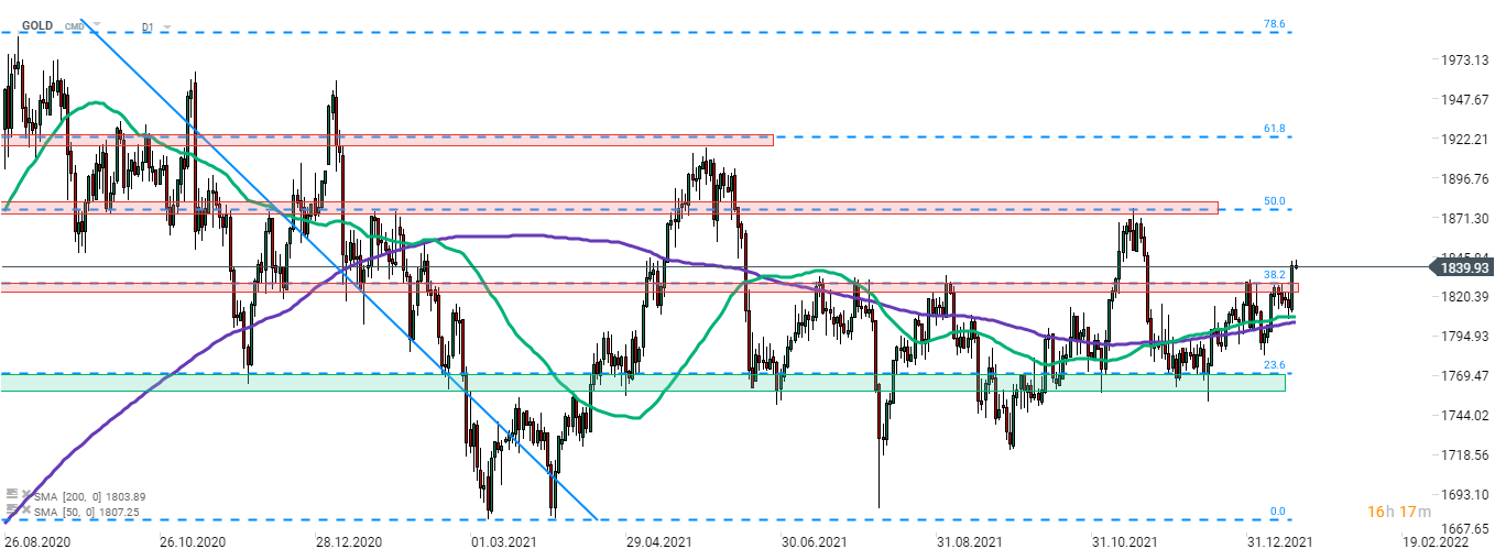 Gold is trading slightly lower today following a massive rally yesterday. Precious metals gained over 1.5% and managed to close above a mid-term resistance zone marked with 38.2% retracement of the downward move launched in August 2020. Next resistance in line can be found at 50% retracement in the $1,875 area. Source: xStation5