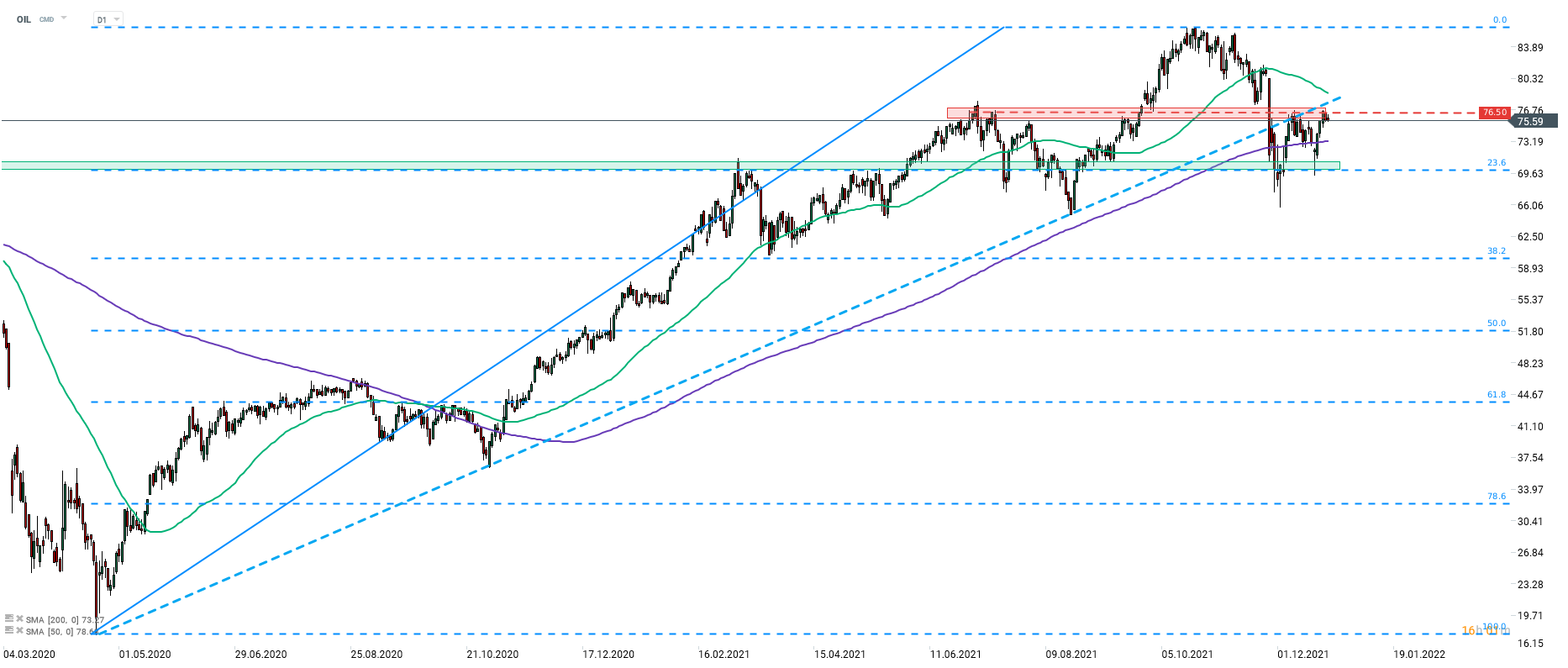 Oil is pulling back slightly following a Christmas weekend that saw many US flights cancelled due to Omicron. Brent (OIL) pulls back from the $76.50 resistance area that serves as upper limit of trading range. Lower limit can be found in the $70 area. Source: xStation5