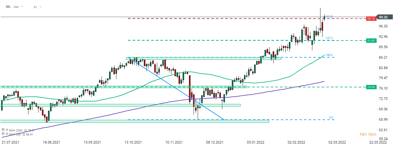 Western countries moved to target Russian reserves as well as cut off part of Russian banks from SWIFT. There is a risk that Russia may retaliate by cutting off energy exports to Europe. However, this would be a massive hit to Russian revenues. Brent (OIL) jumped at the start of a new week and once again trades above $99. Source: xStation5