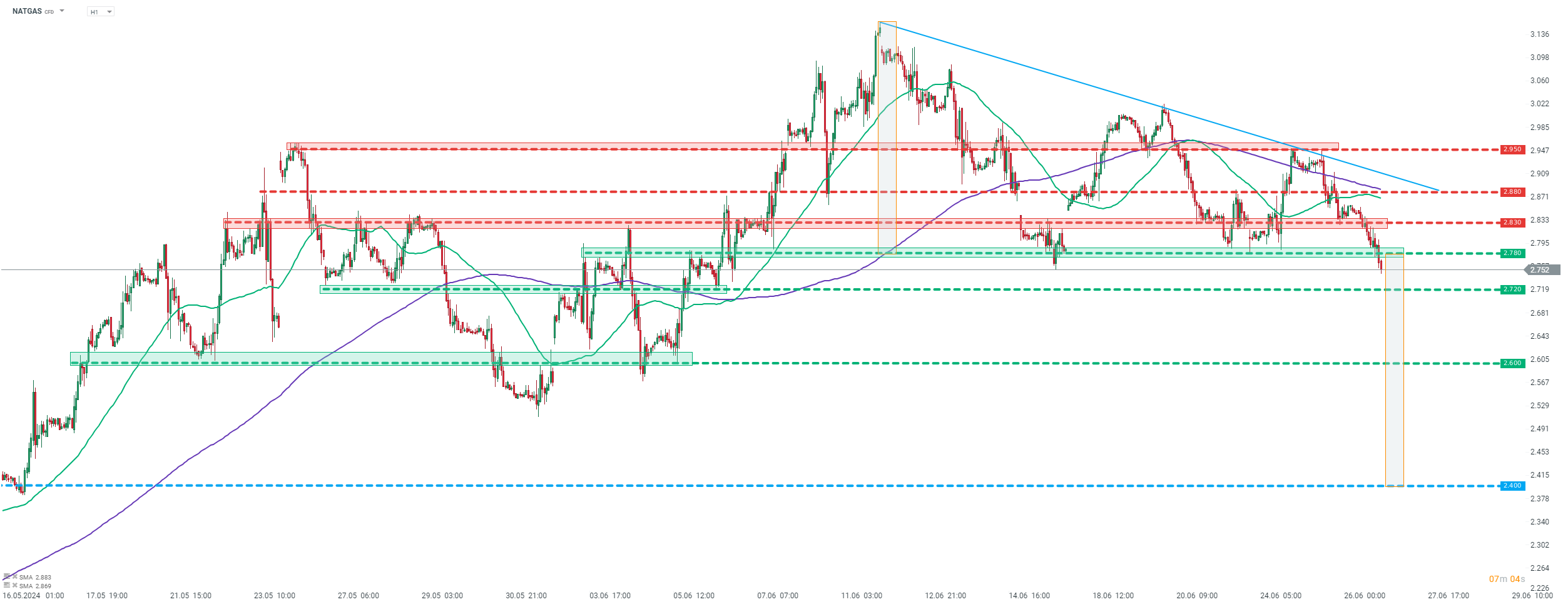 Taking a look at NATGAS chart at H1 interval, we can see that the price dropped below last week's and this week's lows in the $2.78 area and tested June 17 lows in the $2.75 area. Bears managed to push the price below those, printing a new 3-week low. Should bearish momentum continue and price continues to drop, the next short-term support zone to watch can be found in the $2.72 area, followed by $2.60 area. A point to note is that the aforementioned $2.78 area also marked the lower limit of the descending triangle pattern, with a textbook target of the downside breakout being $2.40 area. However, price would need to break below aforementioned $2.72 and $2.60 zones first.