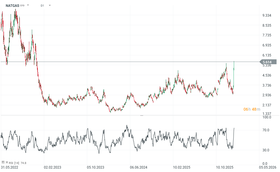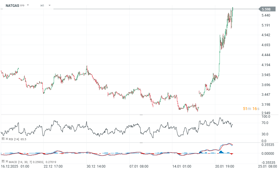 Gains in the natural gas market remain strong ahead of today’s scheduled contract rollover. US Henry Hub natural gas (NATGAS) is up nearly 11%, climbing toward $5.6 per MMBtu. In just three sessions, US natural gas futures have surged by roughly 75%, reaching their highest levels since 2022.