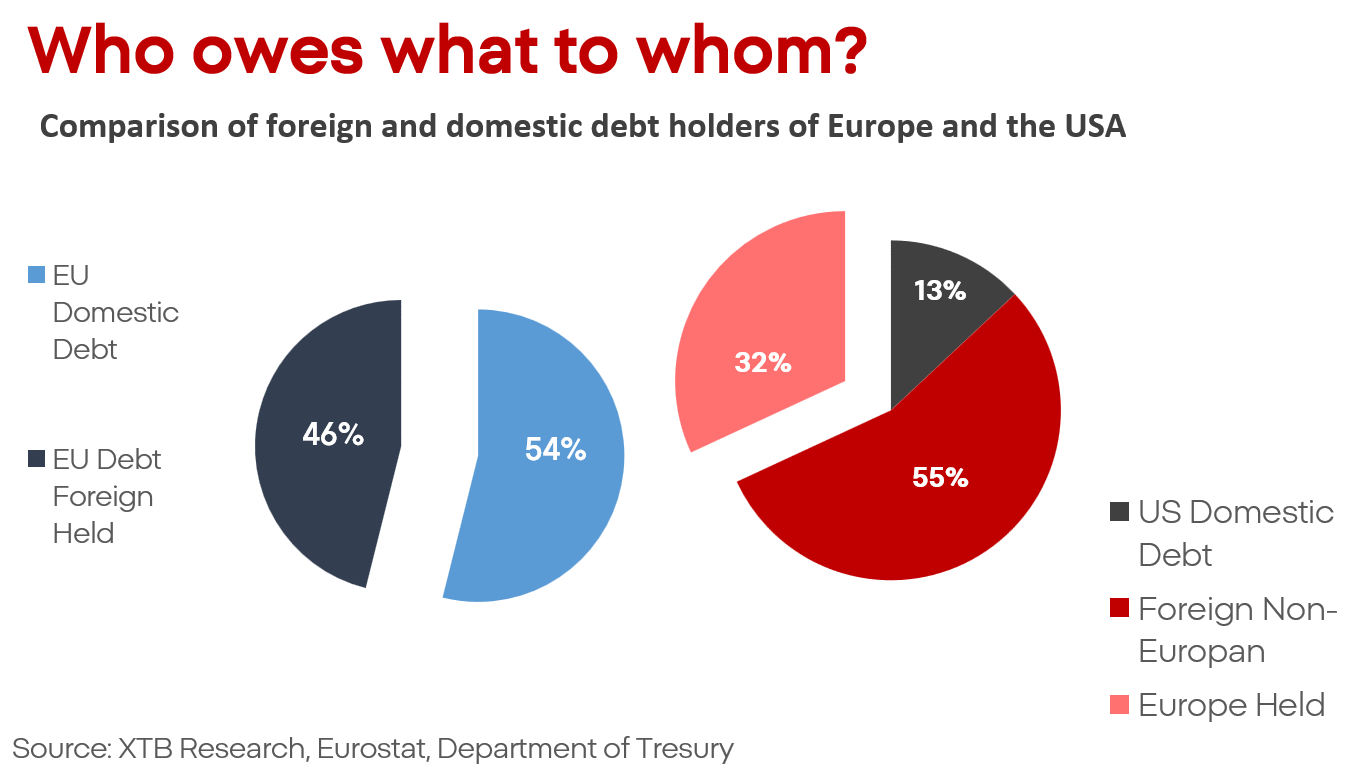 This is a good moment to move to the market essence. Americans have a huge problem with debt, much larger than Europe. At the same time, their dependence on foreign creditors is significantly greater.