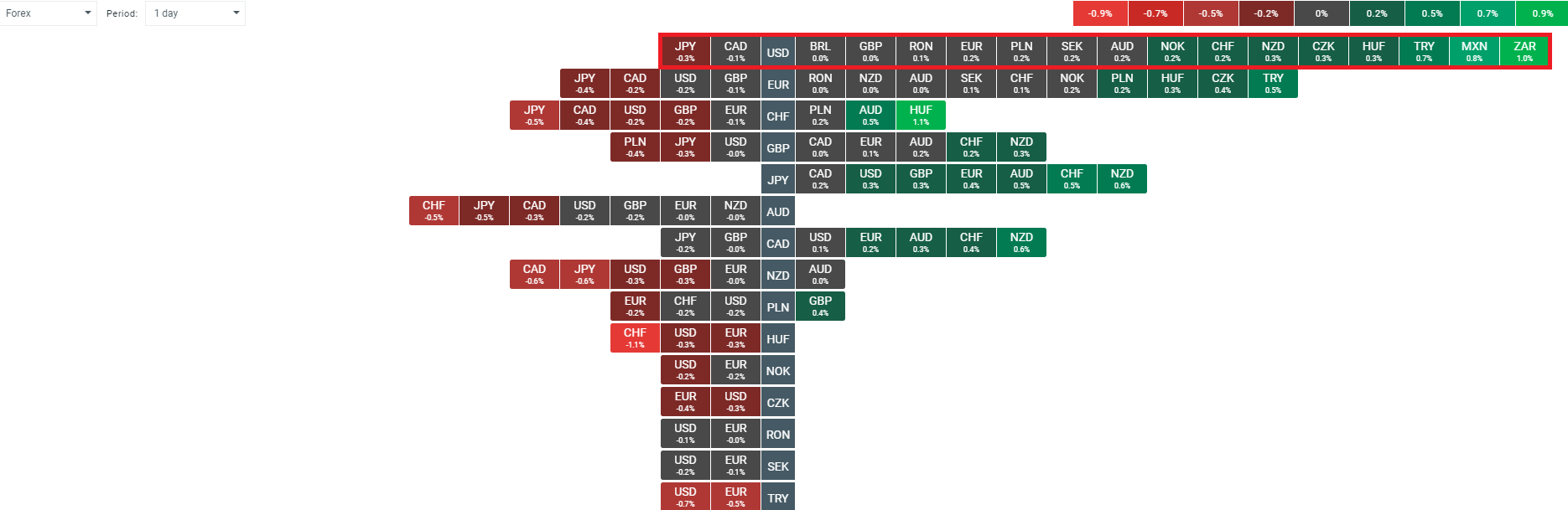 Given the overall solid feel of the data the market has reacted as expected with yields rising along with the US dollar while Gold fell lower. However, the moves have been fairly small and contained so far and a quick look at the heatmap reveals that the USD remains lower against most currencies on the day. Emerging market currencies seem to be the biggest gainers with the ZAR, MXN and TRY leading the way.