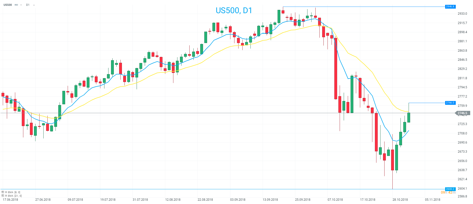 Despite the recent gains the US500 remains in a downtrend according to the EMAs with today’s peak of 2766 a possible resistance level to keep an eye on. Source: xStation
