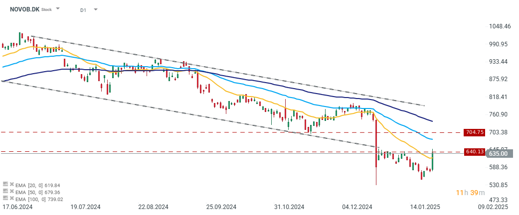 The company's stock surged by over 10% following news of the successful clinical trial results. Novo Nordisk has been in a downward trend since mid-2024, at one point falling below 550 DKK, a level last seen before the publication of the first significant studies on the potential impact of the drug Wegovy on reducing the risk of heart disease in patients, which the company presented in August 2023. Source: xStation.