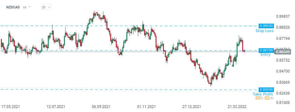 Morgan Stanley recommends taking a short position on NZDCAD at 0.8670 with a target of 0.8300 and a stop loss order placed at 0.8900. Source: xStation5