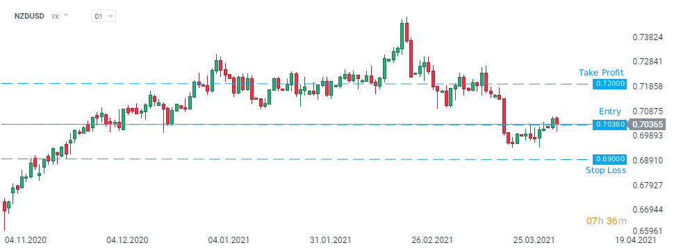 TD Bank recommends taking a long position on NZDUSD at 0.7036 with a target of 0.7200 and a stop loss order placed at 0.6900. Source: xStation5
