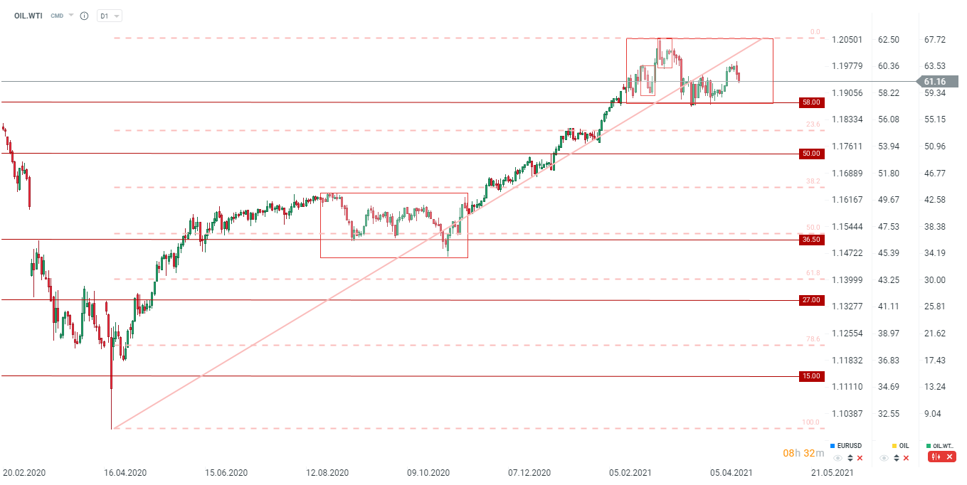 WTI crude oil is losing more than 2% today and is testing the area around $ 61 a barrel. Yesterday the price was trading around $ 64 a barrel, the highest level since March 18 and around 5% from the pandemic highs around $ 68 a barrel. One of the reasons for stronger declines may be the strengthening dollar, although we did not receive any more important information from the market. OPEC + is unlikely to have a decision-making meeting next week, but last time the plan was predetermined for 3 months. One factor that may cause mixed sentiment in the oil market is uncertainty regarding demand. India is seeing a significant increase in coronavirus cases, which could delay the recovery in demand in the country. Also China is reducing oil imports after heavy purchases in March. The key support for WTI is located in the region of $ 58-60 a barrel and is marked with the lower limit of the overbalance structure.