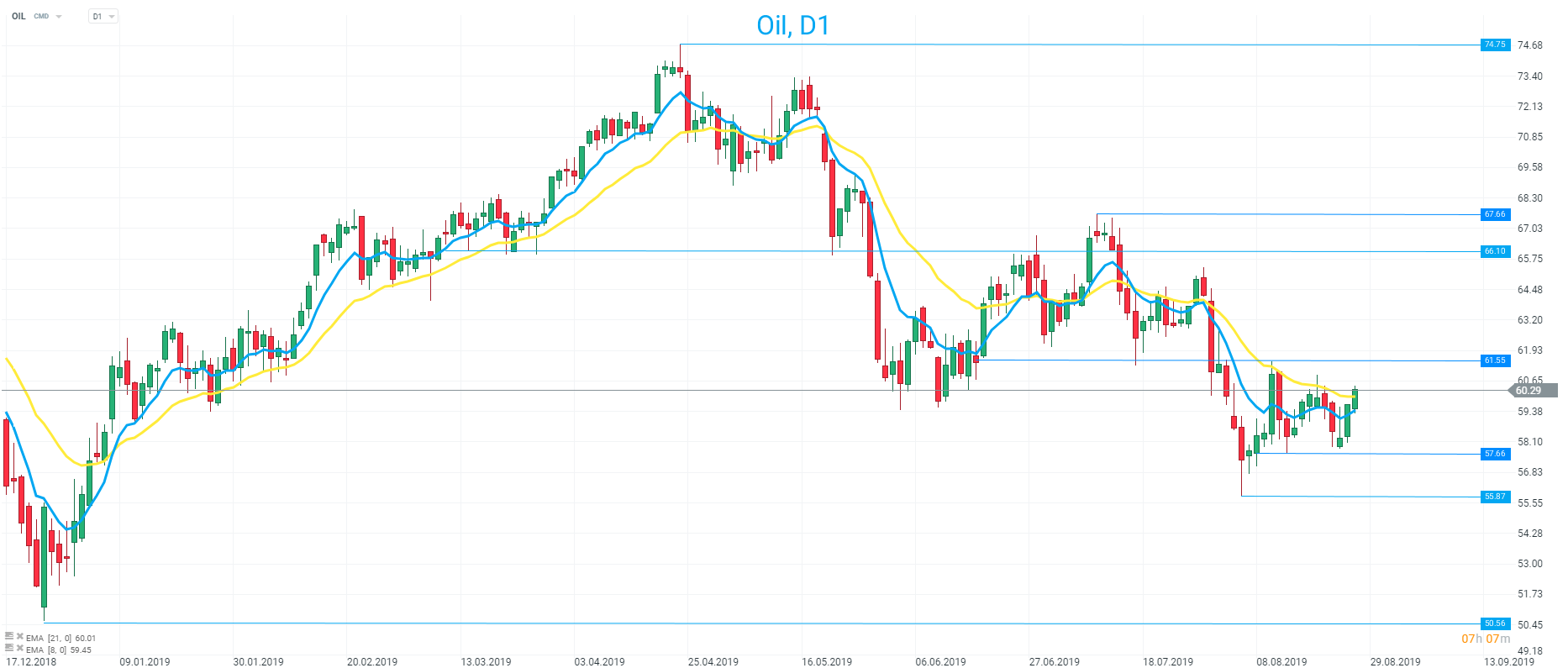 Longer term, the trend could be turning higher for Oil with price edging back above the 21 EMA. It’s over a month since the market ended the day above the 21 EMA and while the 8 remains below it, it has gained and turned higher in recent trade. Source: xStation
