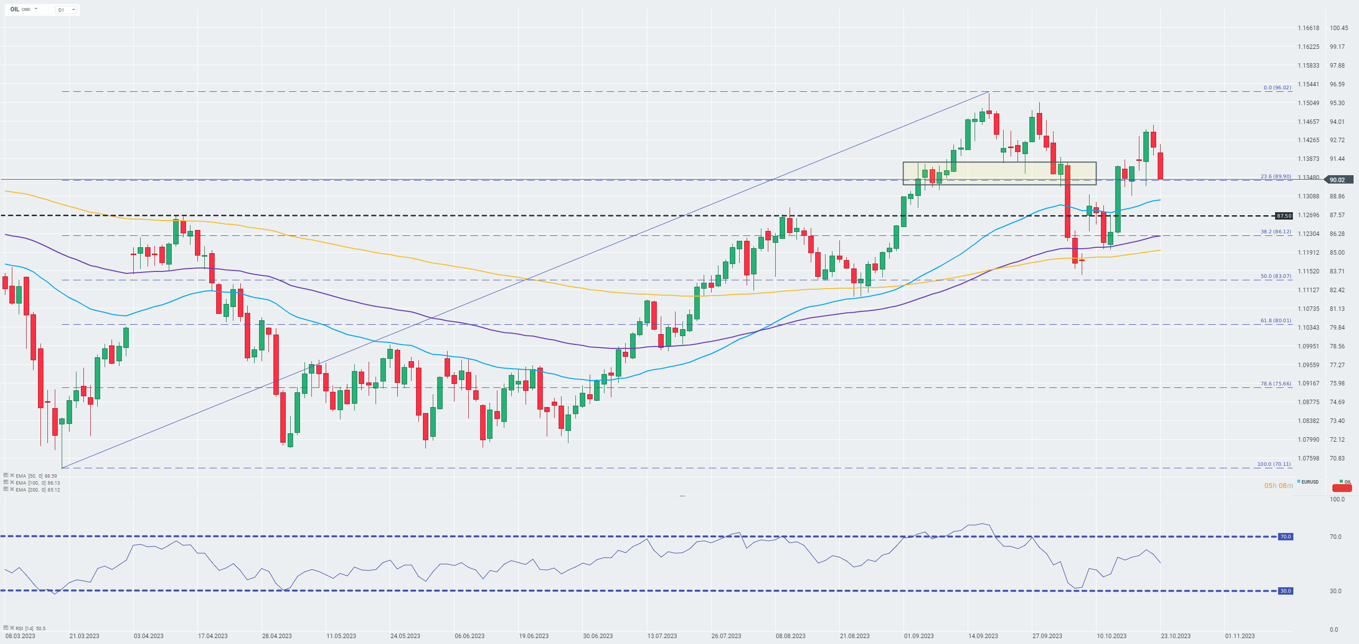 BRENT crude oil is losing more than 2.5% during Monday's trading session. Although the sell-offs have been quoted since the beginning of the day, their scale accelerated after communications by Al Arabiya TV, where it was reported that Hamas will release an unspecified number of foreign hostages in the coming hours. This information somewhat softens the uncertainty surrounding the ongoing dispute.